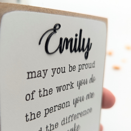 This desk plaque is perfect! As described and a unique and personalized gift to give our daughter. The speed of delivery was impressive.